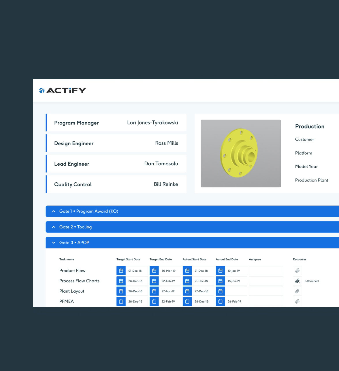 Introducing the first application suite to manage the end-to-end automotive program lifecycle. Purpose-built with and for Tier 1 suppliers, Actify connects with your existing information systems, adapting them for program-based manufacturing. Actify provides the customer and program-oriented status and control you need spanning all phases of your OEM supply programs.